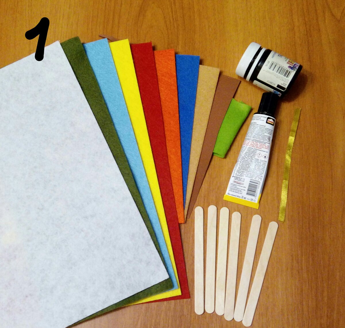 1. Для работы нам понадобятся: картон 20х30см., фетр: белый, зеленый, салатовый, голубой, желтый, красный, оранжевый, синий, бежевый, светло-коричневый, четыре деревянные палочки от эскимо, тонкая атласная ленточка, клей "Момент", черная краска по ткани. 2. Рисуем на бумаге эскиз аппликации. 3. Из голубого фетра вырезаем деталь неба, наклеиваем ее на верхнюю часть картона. Из зеленого фетра вырезаем деталь полянки, приклеиваем ее на нижнюю часть картона. Две деревянные палочки делим пополам каждую, наклеиваем на полянку вертикально. Две других палочки наклеиваем поверх них горизонтально. Получается забор. 4. Из желтого фетра вырезаем круг солнца, из белого - три тела овечек, три челки, три облака. Из салатового - 15шт. листиков разной величины, из бежевого - три мордочки, шесть ушек, из светло-коричневого - девять ножек, из синего - три цветка, из оранжевого- четыре цветка. Из желтого и красного кружочки - центры цветков. 5. На полянку наклеиваем ножки овечек, поверх них клеим белые де