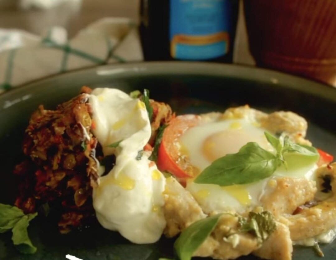 Сегодня хочу поделиться с вами вкусным, сытным и полезным обедом как в ресторане, иначе и назвать нельзя. Приготовленное блюдо заворожит вас приятным запахом, интересной подачей и чудным вкусом. Но это еще не все, рецепт подходит для людей, соблюдающих правильное питание и если вы бережете свою фигуру, то он точно для вас! Ингредиенты: -куриное филе -помидор-1шт -чеснок-1шт -рассыпчатый творог-400гр -кинза -яйца Гарнир -лук репчатый -подсолнечное масло для обжарки -консервированный горошек -консервированная фасоль -сметана обезжиренная для подачи Приготовление 1. Нарезаем филе на полоски, помидоры на дольки. Смешиваем филе, с помидорами, давленным чесноком, специями и творогом. На смазанный противень маслом выкладываем в виде колодцев и ставим в духовку на 7 минут при 180 С. 2. В колодцы заливаем яйца и отправляем в духовку на 7 минут. 3. Обжариваем нарезанный лук добавляем консервированные овощи, крошим рубленную зелень. После обжарки превращаем всю в пюре с помощью толкушки. Подаем