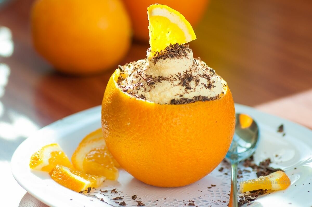 Ингредиенты: сок из одного апельсина, немного цедры, 2 яйца, сахар - 75 гр, ванилин, сливки 33 % - 500 мл