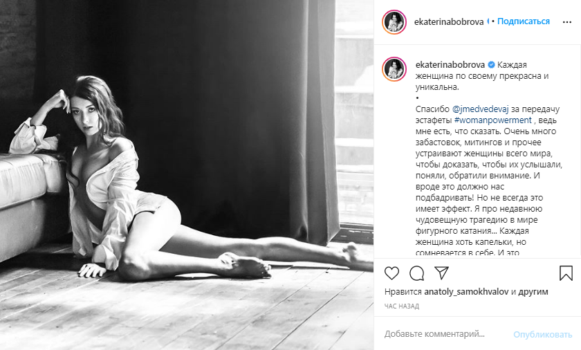 В интернете набирает популярность челлендж "Расширение возможностей женщин", в рамках которого известные девушки и женщины выкладывают свои черно-белые фото и поддерживают друг друга. К челленджу активно присоединяются и спортсменки, в частности фигуристки. Они делятся эффектными фото, а в подписях стараются поддержать каждую женщину. "Каждая женщина хоть капельки, но сомневается в себе. И это нормально. Ведь каждая хочет добиться идеала. И я хочу, чтобы каждая девушка, женщина, в которой эта капелька сомнения есть, у которой не всё на данный момент удачно складывается в жизни, прочитала этот пост", - написала Екатерина Боброва, принявшая эстафету от Евгении Медведевой. «Будем честны — мы потрясающие. Красивые и вкусно пахнем. Иногда опасные, но нежные. Такие разные каждый день, но всегда остаёмся собой. Женщины, помните, что вы сильны и неповторимы», - написала в свою очередь Медведева. «Давайте всегда поддерживать друг друга», - призвала Виктория Синицина. "Мне очень повезло, что в