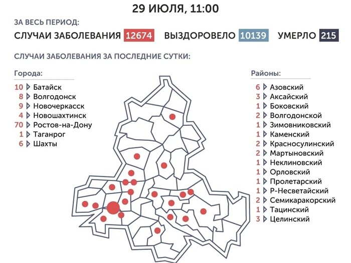 По данным Роспотребнадзора, за последние сутки в Ростовской области излечились от коронавируса 159 человек. За весь период в области выздоровели уже 10139 заболевших. Число подтверждённых инфицированных коронавирусом увеличилось на 136 и на утро 29 июля достигло 12674. Показатель заболевших на 100 тысяч жителей – 301,6. Коэффициент распространения инфекции – 1,09. Новые инфицированные зарегистрированы в 22 городах и районах региона: в Ростове-на-Дону (70), Батайске (10), Новочеркасске (9), Волгодонске (8), Азовском (6) районе, Шахтах (6), Новошахтинске (4), Целинском (3), Аксайском (3), Красносулинском (2), Мартыновском (2), Семикаракорском (2), Волгодонском (2) районах, Таганроге (1), Пролетарском (1), Родионово-Несветайском (1), Орловском (1), Зимовниковском (1), Боковском (1), Каменском (1), Тацинском (1) и Неклиновском (1) районах. Среди новых заболевших 30,1% - в возрасте от 18 до 45 лет, 42,6% - от 46 до 65 лет, 19,9% - от 66 до 79 лет, 3,7% - старше 80 лет, 3,7% - дети. Ле