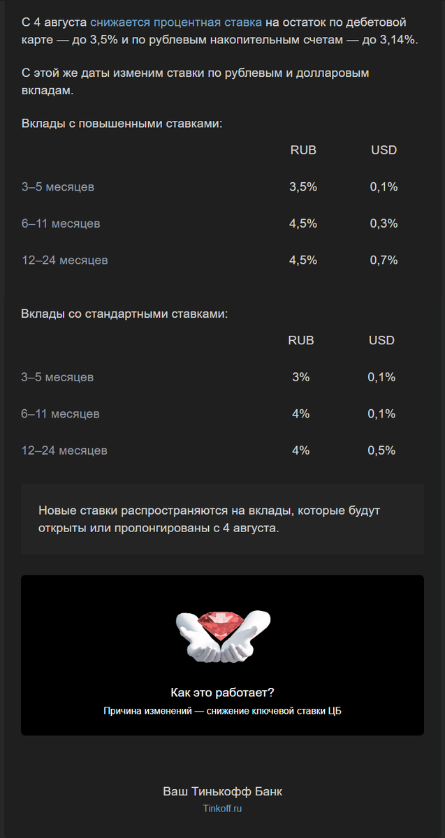 Я уже давний пользователь Тинькофф-банка, которым я с удовольствием пользуюсь уже более 5 лет. Но удовольствия становится с каждым годом все меньше. Например, сегодня банк "порадовал" меня вот таким сообщением. А, ведь, когда-то в начале ставка была целых 7%! Которая с каждым годом все снижается и снижается... Видимо, кризис окончательно добрался и до них. А как обстоят дела с вашими банками и процентами по картам?