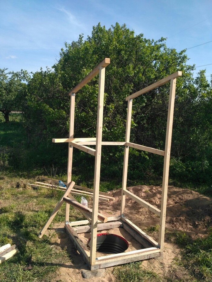 Однажды осенью я решил построит туалет. Начал копать яму и как выяснилось позже переусердствовал раз мер ямы вышел 80х80х190. К сожалению построить сам туалет осенью не удалось. А уже весной я увидел что яма начала осыпаться, более опытный товарищ сказал мне что нужно эту яму засыпать так как со временем туалет просто туда провалиться или же нужно делать серьёзный фундамент. Ни один из вариантов меня не устраивал. Ибо к этой яме я прикипел душой) расстроившись и поспав с этой мыслью я принял волевое решение - засыпать яму НО частично и с каркасом. Для каркаса купил 200 литровую бочку у которой вырезал обе крышки , накидал на дно ямы булыжников для дренажа и поднятия уровня для бочки. Установил каркас, засыпал все песком и по уровню вкопал четыре средних камня. Дальше будет меньше слов и больше фото. Для каркаса я использовал брус 50х50 необрезной, обшивал плитой ОСП 6мм, крыша из поликарбоната 8 мм Вот собственно сам каркас за первый день работы Строили сортир а получилась беседка (п