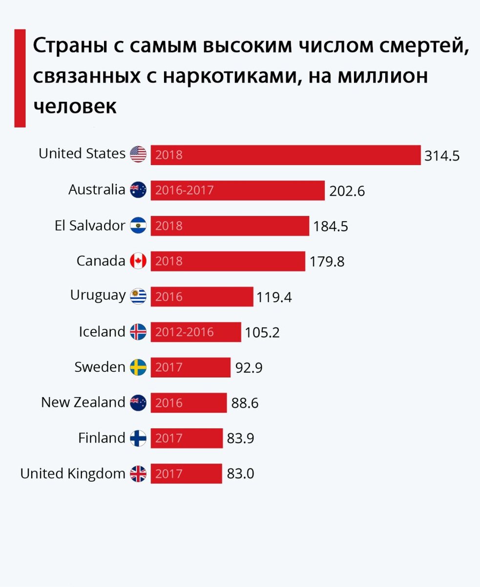 Страны с наибольшим количеством смертей от наркотиков.