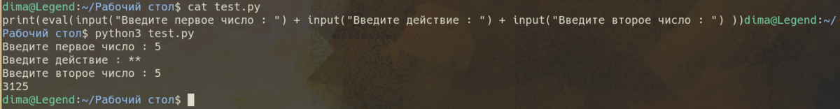 Кхм , я не это имел в виду , когда говорил про что-то более серьёзное в прошлой статье , просто пишу о том , что быстрее в голову придёт =) В общем , в этой статье я расскажу как можно написать полноценный калькулятор на python3 всего в одну строчку . Это можно реализовать при помощи функции eval . Функция eval в качестве аргумента принимает python код , который нужно выполнить , то есть функция eval выполняет python код . В общем , без лишних слов , это и есть калькулятор в одну строку : print(eval(input("Введите первое число : ") + input("Введите действие : ") + input("Введите второе число : ") )) Что тут происходит : Мы выводим вывод функции eval , в которую передаём значения из input . В input мы узнаём числа и действие . Давайте глянем на эту строчку в действии : Как видим , оно работает . На этом мы закругляемся ... До следующей статьи , пока ! И вот эту вот штуку надо тут оставить : Если уж вы дошли до этого момента , то почему бы вам не поставить класс и не подписаться ?