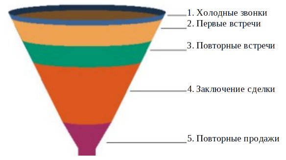 Он совершает 100 холодных звонков (незнакомым людям) в месяц и договаривается о 20 первых встречах (самопрезентация, выяснение потребностей клиента). На повторную встречу (представление коммерческого предложения) соглашается 10 клиентов, до сделки доходит 3 клиента. Из них постоянным становится 1 клиент.