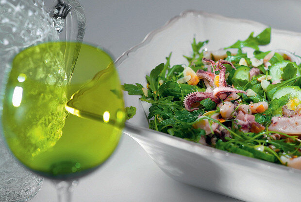 2. Накалить сухую сковороду, присыпать ее морской солью (хватит большой щепотки), кинуть туда всех морских гадов и обжаривать около пяти минут. Поперчить, за минуту до готовности добавить мелко нарезанный чеснок, влить вино, подождать, пока оно выпарится, и снять сковороду с огня.