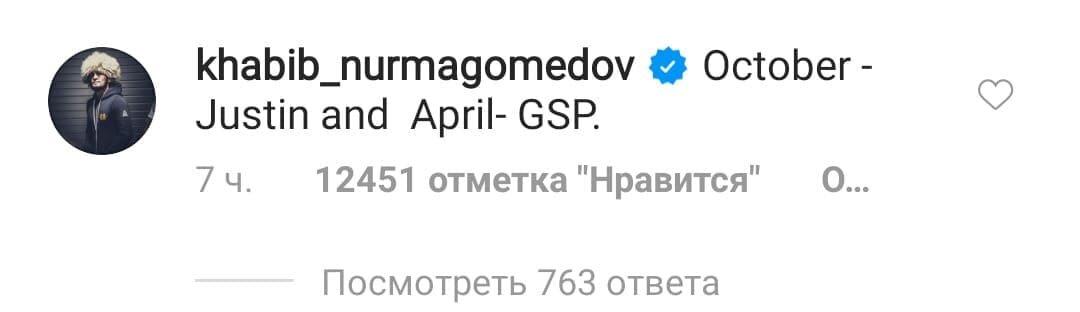 Российский чемпион UFC Хабиб Нурмагомедов подерется за чемпионский титул в октябре с американским бойцом и временным чемпионом Джастином Гейтжи. Напомним, что Гейтжи выиграл в бое за титул временного чемпиона против Тони Фергюсона, тем самым заработав бой за титул чемпиона. Хабиб так же заявил что в апреле будет бой с GSP(Джордж Сан-Пьер), бой который хотел его отец. Бой между Гейтжи и Хабибом возглавит турнир UFC254. Хабиб заявил о бое с GSP в комментариях страницы Instagram комментатора Джо Рогана. Турнир UFC254, как говорил Дана Уайт пройдет в бойцовском острове в Абу-Даби. Ранее Хабиб сказал что "Фергюсон, Макрегор и Сен-Пьер, и на этом можно заканчивать карьеру". Но после смерти его отца решения изменились, и Хабиб намерен остановить карьеру со счетом 30-0, после боев с Гейтжи и Сен-Пьером. Отец Хабиба говорил что бой его мечты это с Джорджом Сен-Пьером. Напомним, что Сен-Пьер двухкратный чемпион UFC, чемпион в полусреднем и экс-чемпион в среднем весе. Абдулманап так же говорил,