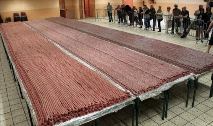 Какой длинны колбаса? Наверно сантиметров 30-40. Да, обычно она именно такая, но некоторые мясники считают, что это кулинарное изделие должно быть слегка больше. Однажды, двое смелых мужчин рискнули и приготовили гигантскую, нереальной длинны колбасу – 2025 метра. Этот феномен был приготовлен в городе Паен, над ним трудились почти 7 часов и использовали около тонны мяса. Весь процесс находился под контролем нотариуса и чиновника из продовольственного контроля. Вот такой маленький деликатес.
