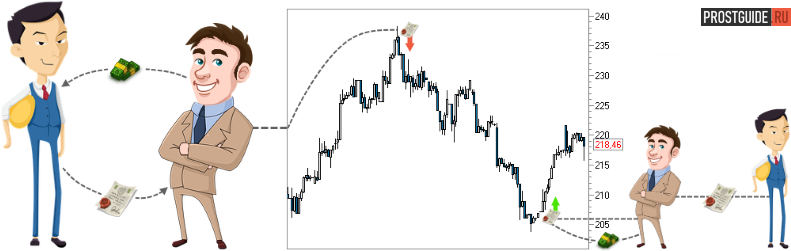 Здесь на помощь инвестору (или трейдеру) приходит брокер. Он дает акции выбранной им компании в долг за определенную плату/комиссию. Эти акции моментально продаются и человек становится в короткую позицию ("короткая позиция - это "Шорт" на русском языке). С момента открытия "Шортовой" прибыль в портфеле инвестора начинает меняться в зависимости от изменения цены на проданный им актив, таким образом, что в случае если цена на актив снижается - прибыль растет, а если цена возрастает, то прибыль уходит в минус. Обратно ситуации когда инвестор покупает акции. Для того чтобы закрыть позицию, инвестору необходимо совершить покупку акций. После покупки и закрытия позиции, акции автоматически возвращаются брокеру. А инвестор открывший короткую позицию остается либо с прибылью, либо с убытком, в зависимости от того куда, вниз или вверх, ушла цена на актив, в момент когда акции были в его руках.