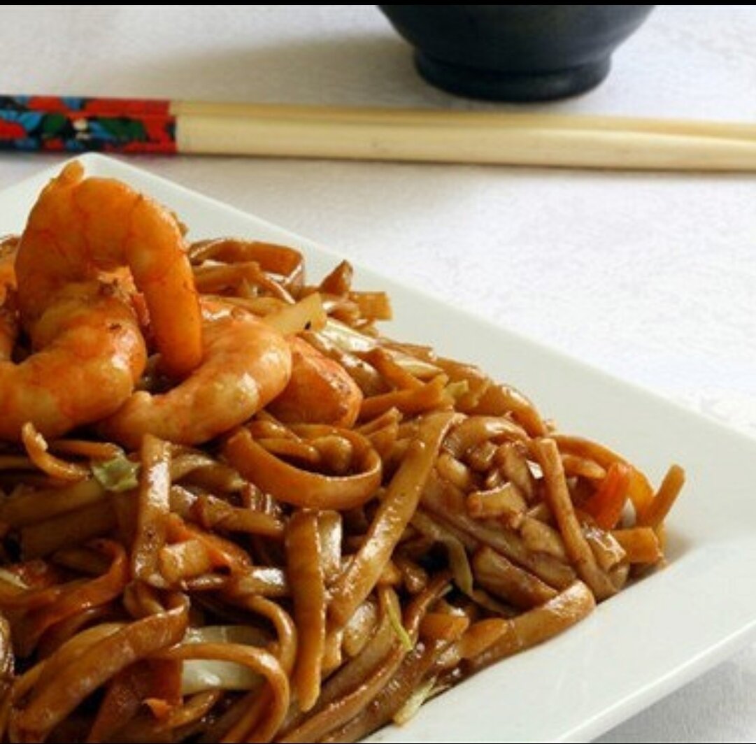 Ингредиенты 1 порция Инструкция приготовления 1. В раскаленном арахисовом масле в сковороде вок обжариваем чеснок и молотый бадьян (звездчатый анис) в течение 30 секунд. 2. Добавляем порезанный зеленый лук и очищенные тигровые креветки и обжариваем еще 2–3 минуты. 3. Добавляем соевый соус, сок лайма и предварительно отваренную в течение 2 минут яичную лапшу, все перемешиваем. 4. Готовую смесь обжариваем на большом огне еще 1 минуту, раскладываем по тарелкам, сверху украшаем кусочками лайма.