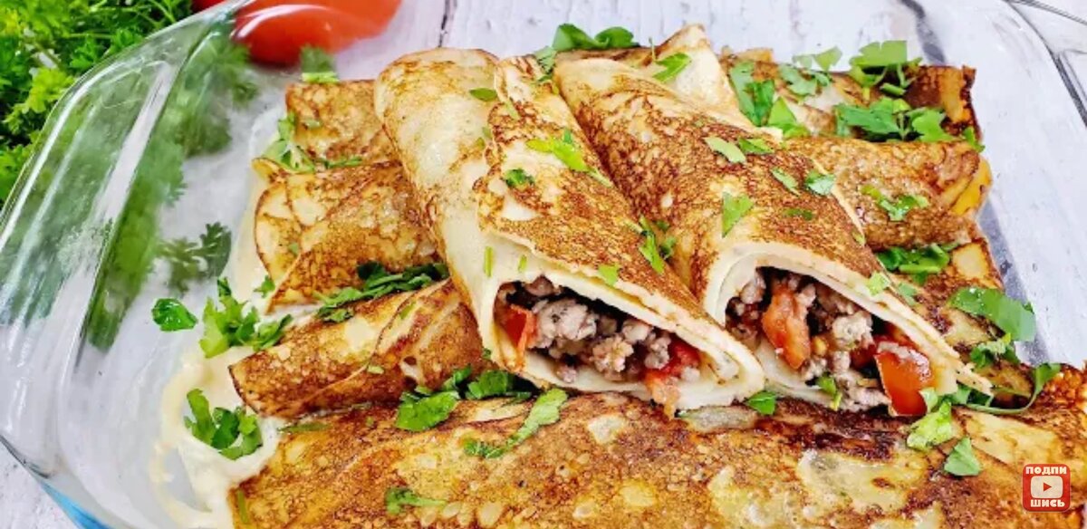 Блины с сочной начинкой можно кушать на обед и ужин, а также как перекус. Приятного аппетита
