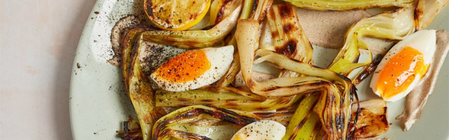 Отлично сработает с пореем гриль сваренное всмятку яйцо и цитрусовый соус (апельсиновый сок, оливковое масло, лимонный фреш, мед, соль, перец) .