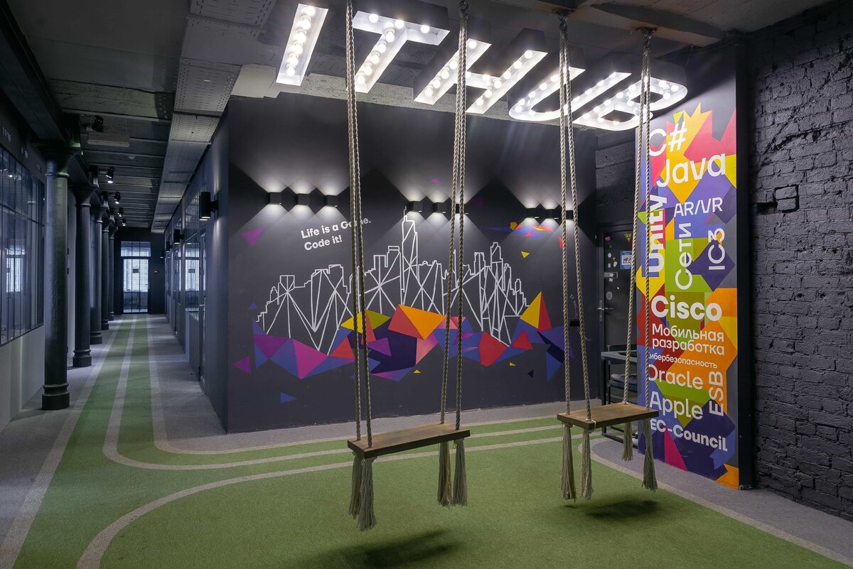 В коридорах и холле на стенах у нас яркие граффити. Первое граффити появилось ещё в прошлом году. А в этом году мы разошлись по полной программе: украсили зону с качелями и коридор. Почему супергерои? Ну а вы видели наших архитекторов специальностей? Каждый из них успевает строить успешную карьеру в IT и уделять время студентам. Супергерои!