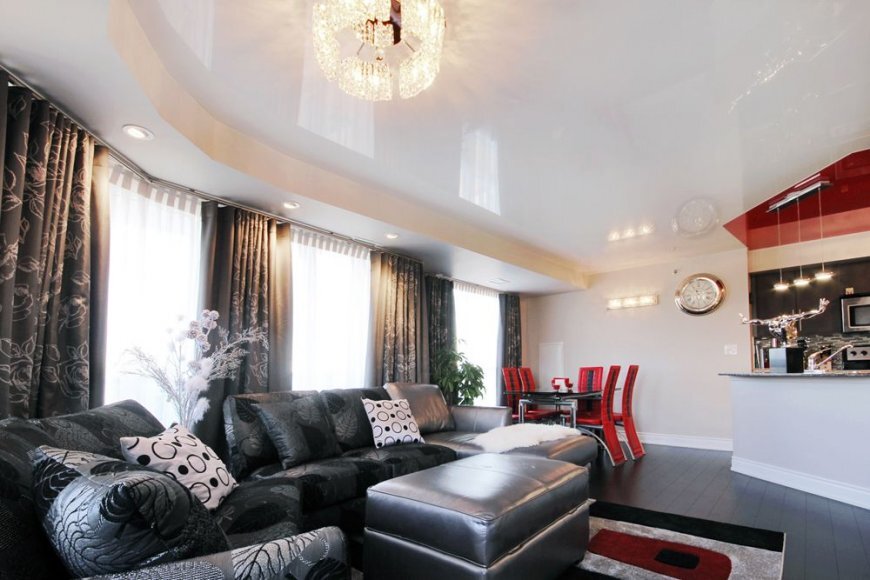 Тут наверное всё четко понятно, что используются в основе матовые полотна и пастельные тона, возможно установить и двухуровневый потолок и правильно подобрать подсветку для вашей гостиной, можно сделать и фото печать на полотне, что бы подчеркнуть ваш стиль и интерьер гостиной.