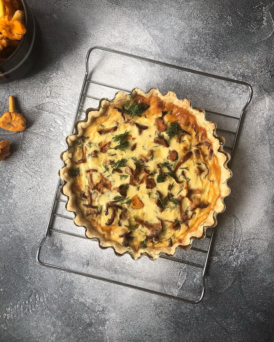 Друзья, всем прекрасного дня☀️ Сезон любимых лисичек в самом разгаре,а значит нельзя пройти мимо и не приготовить этот вкуснейший киш. Готовится быстро, съедается ещё быстрее🙆♀️ Нам понадобится: Для теста ( на форму 20-23см): -250 гр пшеничной муки (8 столовых ложек с горкой) -ледяная вода 3-4 ст.ложки -125гр холодное сливочное масло -соль, сахар - по 1/4ч.л. Для начинки: -лисички 250-300гр -укроп несколько веточек -полутвёрдый сыр 100гр -сливки 20-30% жирности 200мл -яйца 3 шт ⠀ 1.Смешиваем муку, соль, сахар и холодное сливочное масло в блендере до жирной крошки или можно размять все вилкой, смешивая до однородной крошки 2.Добавляем холодную воду ( я кладу пару кубиков льда к воде:охлаждается очень быстро), быстро замешиваем тесто, долго не месим, чтобы масло не растаяло 3.формируем из теста шар, заворачиваем в пленку, убираем в холодильник на 40-45минут 4.достаем охлаждённое тесто и раскатываем в пласт, переносим все в форму для выпечки ( смазывать не нужно), прижимаем к