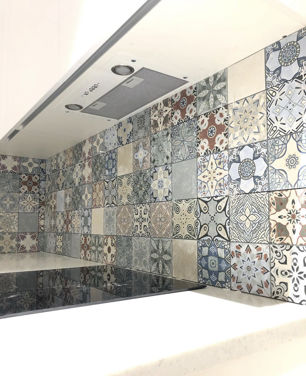 Минусы 👎 Укладка плитки после установки кухни предполагает наличие опыта и аккуратность плиточника. 👎 Дополнительные затраты времени и денег. Если вытяжка каминного или купольного типа, то придется вызывать монтажников, чтобы повесить ее на место. 👎 Чаще всего до укладки плитки не подключается вся электрика на кухне, чтобы лишний раз не вызывать мастера. С этим связаны возможные «сюрпризы» в работ