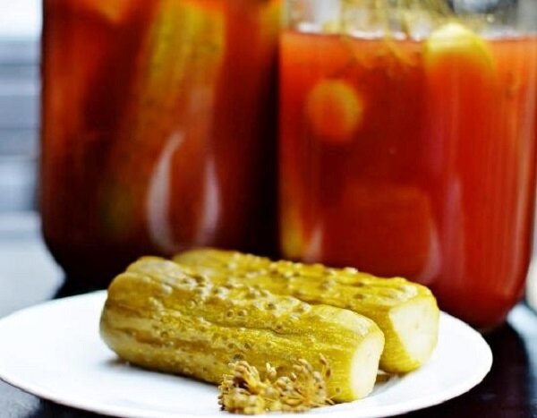 Маринованные огурцы необходимы в любой кухне. Кроме того, что их можно просто подавать на стол как дополнение, например, к гречке с мясом или к картошке-пюре, маринованные огурцы незаменимы при готовке салатов (классический салат оливье, салат Грибная поляна, Селедка под шубой и др.), солянки, рассольника, азу и других блюд. Огуречный сезон в разгаре, а это значит, что нужно заняться заготовками на зиму этих незаменимых овощей. Приведенный ниже рецепт используют в моей семье очень давно – еще с 90-х годов – всегда получалось отлично. Необычность рецепта заключается в использовании кетчупа или поварского соуса. Я использую популярный на Украине томатный соус «Чумак», приготовленный из отборных херсонских помидоров без красителей и консервантов, как гласит надпись на упаковке. Он и в самом деле очень хорош. Но, думаю, подойдет и какой-нибудь другой, например, популярный еще с советских времен соус «Краснодарский», который мы использовали раньше для этого рецепта. Ингредиенты: Примечание