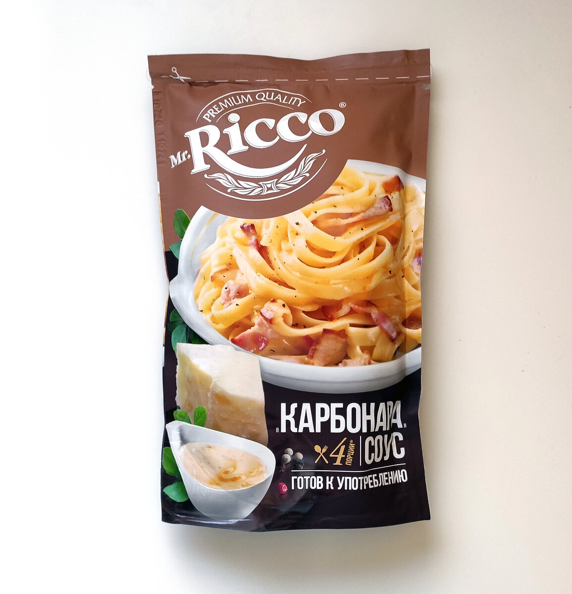 Недавно в магазине Метро я нашел готовый к употреблению соус Карбонара за 75 рублей. Объем пакета рассчитан на 4 порции. Органолептические свойства: кремовый цвет, ненавязчивый синтетический запах, приятная вязкая текстура. Стоимость одной порции карбонары с соусом от mr. Ricco — 60 рублей Стоимость одной порции классической карбонары — 160 рублей