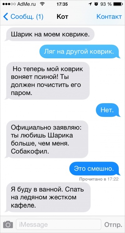 СМС переписка кота и его хозяина. Весьма жизненные ситуации. Про белочку, так сказать, порвало.