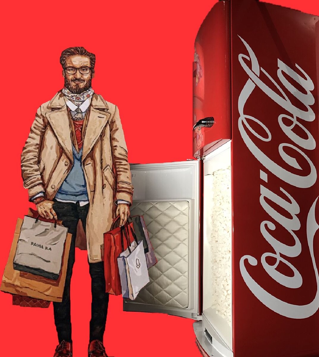 Первый экспонат, который заставил задуматься о жизни - это красный брендированный холодильник "Кока-Кола", наполненный сахаром и представляющий собой открытый гроб. Логика проста: напомнить нам о том, что именно мы потребляем каждый день.
