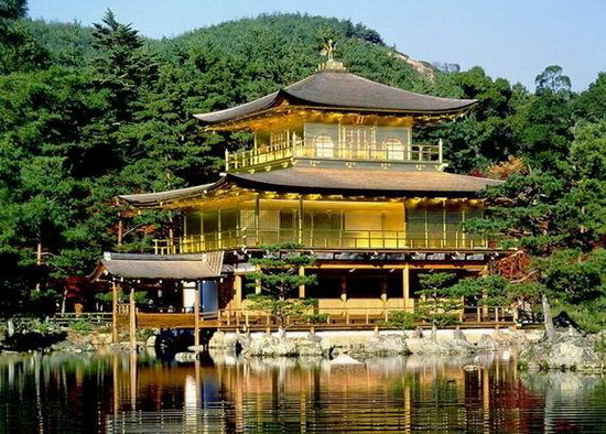 Кинкакудзи - Золотой храм - расположен в северной части Киото на территории буддийского храмового комплекса Рокуондзи. Он был построен в 1397 г. по велению сёгуна Ёсимицу из династии Асикага, здесь он провел последние годы своей жизни, утратив всякий интерес к политической жизни страны. Павильон трехэтажный с двумя ярусами крыш. Его стены по приказу сёгуна Ёсимицу, обожавшего роскошь, были покрыты сусальным золотом, что и дало название этому сооружению. Изначально помещения павильона были предназначены для разнообразной деятельности. Первый этаж (его иногда называют Хосуйин) выполнен в японском архитектурном стиле синдэн-дзукури, расцветшем в эпоху Хэйан и применявшемся в основном при возведении дворцов, домов аристократов. Для второго этажа (Тёонкаку) архитектор выбрал стиль букэ-дзукури (самурайский стиль, более характерный для построек периода Камакура). А верхний, третий, этаж (Кукётё) построен по суровым канонам дзэнской архитектуры. Соответственно, комнаты нижнего этажа сёгун