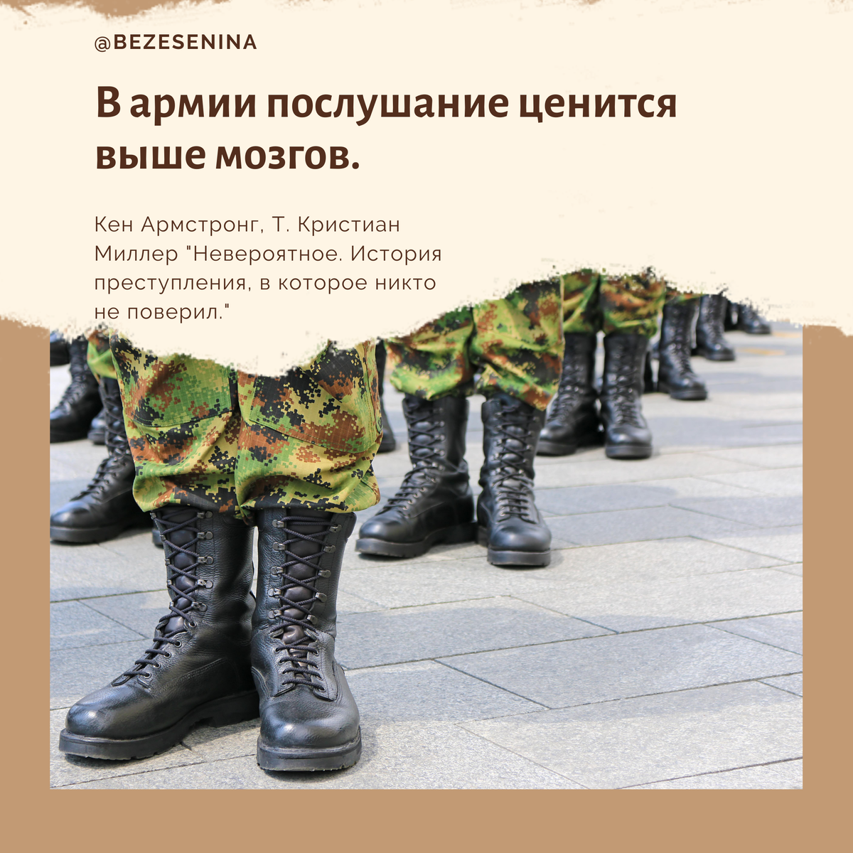 "В армии послушание ценится выше мозгов". Тот случай, когда цитата короче, чем название книги.😅⠀ ⠀ Ну а книгу, из которой цитата, можно выиграть в конкурсе. ⠀ Условия конкурса в моём одноимённом Инстаграме @BEZESENINA.😉