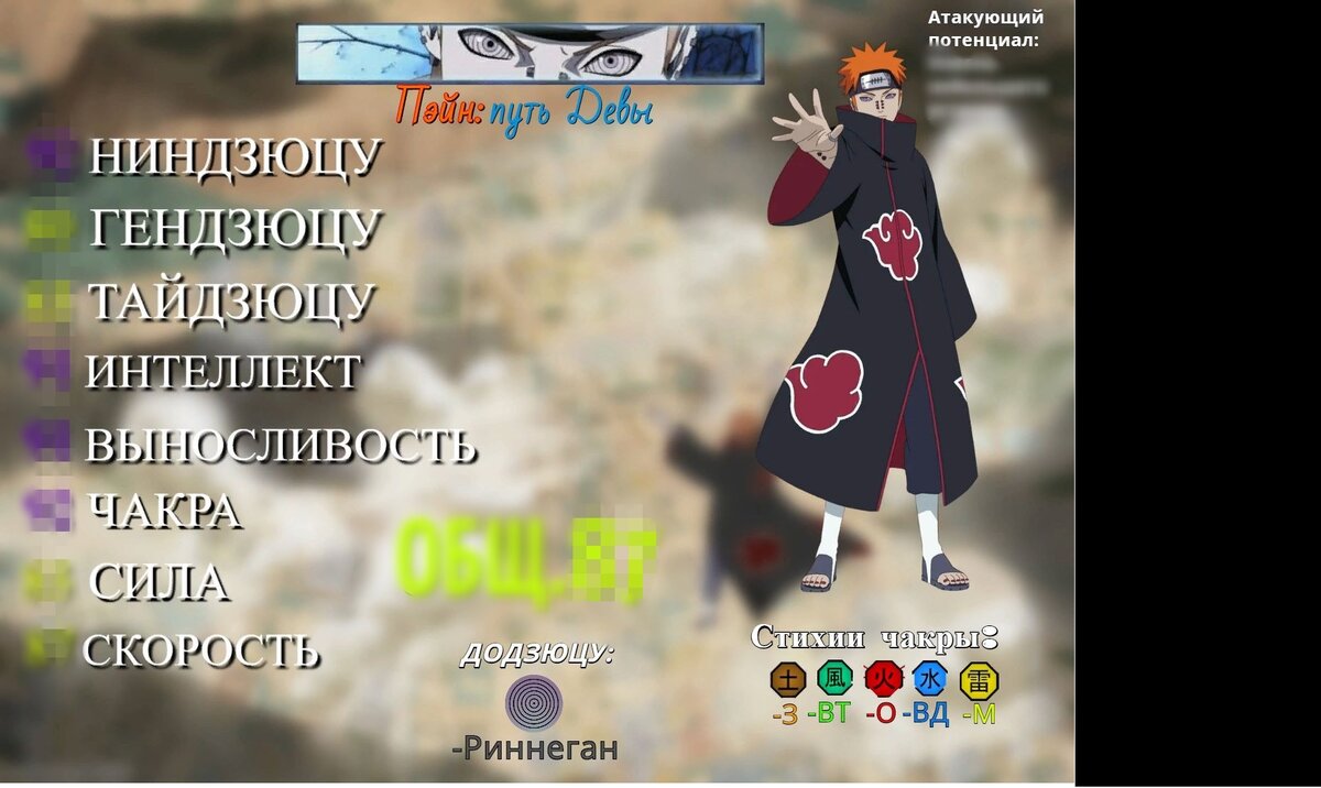 Продолжение моей регулярной рубрики о разборе статов персонажей из аниме Наруто,на этот раз разберем Пэйна,а именно,главное из его тел - путь девы. Эта версия Пэйна представлена его возможностями с риннеганом и манипуляциями с притяжением - форма сильнейшего из его тел. Из всех тел пэйна анализировать его проще всего,т.к у него было больше всего экранного времени. Взглянем: Общий рейтинг вышел 87(у Итачи тоже вышел 87,но Пэйн сильнее,у Итачи я слишком завысил выносливость,думаю,что 80 ему многовато,думаю если поставить Итачи 75,то средний общий рейтинг у него выйдет 86 - это было бы корректнее. Что касается пэйна,еще один персонаж,у которого не выпадает ни одна характеристика,уровень разрушения в небольшой остров обуславливается Чибаку и заряженной Шинрой тэнсей. Интеллект высокий,но не топовый,как лидер акацки и персонаж,который быстро анализировал ситуацию вокруг себя - достоин показателя больше 90.Уровень чакры и выносливости также хорош,Пэйн проделал огромный объем работы от н