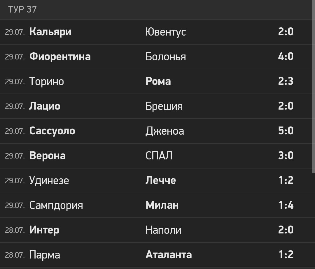 Вчера завершился 37 тур Серии А. Подведем итоги) 28 июля тур открывал матч Аталанты и Пармы. Фаворитом была Аталанта, так что ее победа не стала удивлением, несмотря на то, что Парма забила первой. Матч завершился со счётом 2:1. Голы забили Кулусевски 43'(Парма), Малиновский 70'(Аталанта), Гомез 84'(Аталанта) Вторым матчем стал Интер - Наполи. Очень статусный и интересный матч. Наполи пропустили первыми и пытались отыграться весь матч, но Лаутаро Мартинез своим пушечным ударом из-за штрафной удвоил преимущество своей команды и свёл все старания на нет. Матч так и завершился со счётом 2:0 в пользу Интера. Голы забили Д'Амброзио 11' (Интер) и Мартинез 74' (Интер) Следующий матч прошел уже 29 июля. Им стал Сампдория - Милан. Матч получился результативным, а поспособствовал этому быстрый гол Златана Ибрагимовича на 4 минуте. Итоговый счет: 4-1 в пользу Милана, который был явным фаворитом этого матча. Так же матч запомнится незабитым пенальти Марони (Сампдория) на 78 минуте. Голы забили Ибр