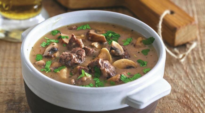Такой супчик хоть и готовится просто, получается наваристым и вкусным. Готовится из говядины и грибов. Грибочки вы можете взять любые, даже вешенки или шампиньоны – более экономный вариант. Нам потребуется: - литр воды; - полкило говядины; - горсточка грибов; - имбирный корень, кольраби, соевый соус, жир, любые специи. 1. Промойте говядину, порежьте порционными кусочками, поджарьте на жирке вместе с измельченным имбирем. Влейте воду, варите мясо на большом огне – бульон при этом должен наполовину выкипеть. 2. Процедите бульон. Добавьте к нему ломтики грибочков, измельченную кольраби, доведите снова до кипения. 3. Приправьте суп любимыми специями, накройте крышкой, варите десять минут. В уже готовый суп по-пекински добавьте соевый соус по вкусу. Подавать первое блюдо требуется горячим, можете каждую порцию украсить веточками зелени.