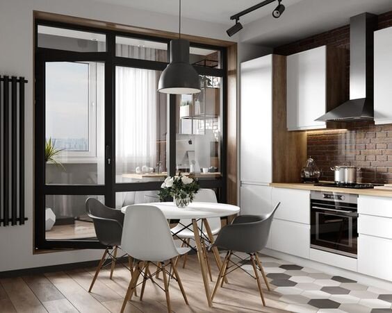 - При планировке кухни обратите внимание на размещение вентиляции и проектируйте плиту и вытяжку поблизости