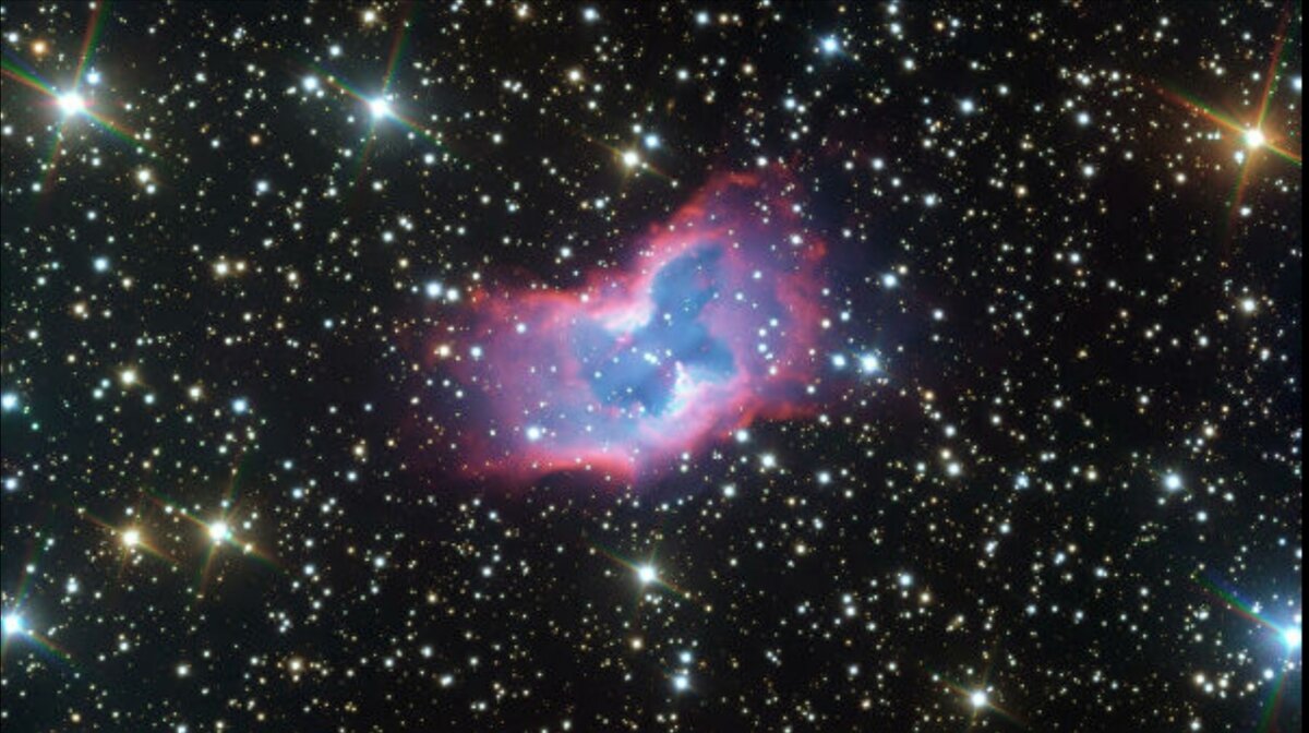 Очень большой телескоп (VLT) Европейской Южной Обсерватории (ESО) в Чили получил новое изображение газовой туманности NGC 2899, своей симметричностью, игрой цвета и сложной внутренней структурой напоминающей порхающую в ночном небе разноцветную бабочку. Об этом сообщается на официальном сайте ESО.Эту планетарную туманность еще никогда не удавалось сфотографировать в таких мельчайших деталях — видны даже просвечивающие сквозь фоновое звездное поле ее слабые внешние края.NGC 2899 расположена на расстоянии от 3000 до 6500 световых лет от нас в южной части созвездия Парусa. Считается, что ее почти идеальная симметричная структура связана с наличием двух центральных звезд, одна из которых завершила свою эволюцию сбросила в окружающее пространство внешние оболочки. Вторая звезда теперь взаимодействует с этими потоками газа, образуя видимую на фото двойную структуру. Только примерно 10–20 процентов всех планетарных туманностей имеют такую биполярную форму.Обширная газовая оболочка NGC 2899 разлетелась от своего центра на расстояние до двух световых лет. Газ в ней разогрет до температуры около десяти тысяч градусов и туманность ярко светится на фоне звезд Млечного Пути.Высокая температура газа объясняется мощным излучением материнской звезды, породившей эту туманность: водород, из которого в основном и состоит газовая оболочка, под его воздействием светится красноватым светом, а кислородный газовый слой — голубым. Астрономы смогли получить изображение NGC 2899 с таким количеством подробностей благодаря использованию приемника FORS, установленного на UT1 — одном из четырех основных 8,2-метровых телескопов комплекса ESO VLT в Чили. Этот имеющий высокое разрешение инструмент, название которого расшифровывается как "фокальный редуктор и спектрограф низкой дисперсии" (FOcal Reducer and low dispersion Spectrograph), был одним из первых в комплекте навесной аппаратуры ESO VLT.С его помощью уже было получено множество прекрасных изображений и сделано множество открытий. FORS внес свой вклад в оптические наблюдения источников гравитационных волн, с ним исследовался первый открытый межзвездный астероид Он также используется для углубленного изучения формирования планетарных туманностей сложной структуры.Снимок получен в рамках программы "Космические сокровища ESO" (ESO Cosmic Gems) — просветительской инициативы, состоящей в фотографировании на телескопах ESO в образовательных и общественно-просветительских целях интересных, загадочных или просто красивых объектов. Программа выполняется в такое время, когда телескопы в силу разных причин не могут вести научные наблюдения. Тем не менее, все данные, полученные в рамках программы, могут использоваться и в научных целях и доступны астрономам через Научный архив ESO.Кстати, несмотря на свое название, планетарные туманности не имеют никакого отношения к планетам. Первые астрономы, которые наблюдали эти объекты, просто хотели сказать, что визуально они напоминают планетные диски. Эти туманности образуются, когда старые звезды с массами до шести солнечных в конце своей эволюции сжимаются и сбрасывают в пространство расширяющиеся газовые оболочки, богатые тяжелыми элементами.Интенсивное ультрафиолетовое излучение материнских звезд возбуждает и освещает эти разлетающиеся оболочки, заставляя их ярко светиться в течение нескольких т