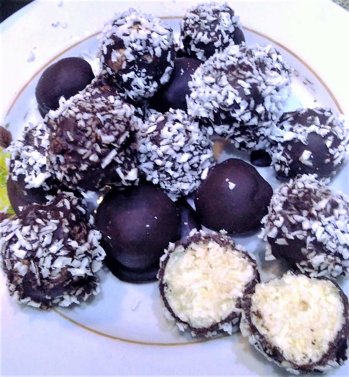 В жидкую теплую шоколадную массу окунаем замерзшие кокосовые шарики и тут же аккуратно кладем на силиконовый коврик. Они тут же застывают. Удобно пользоваться пинцетом.