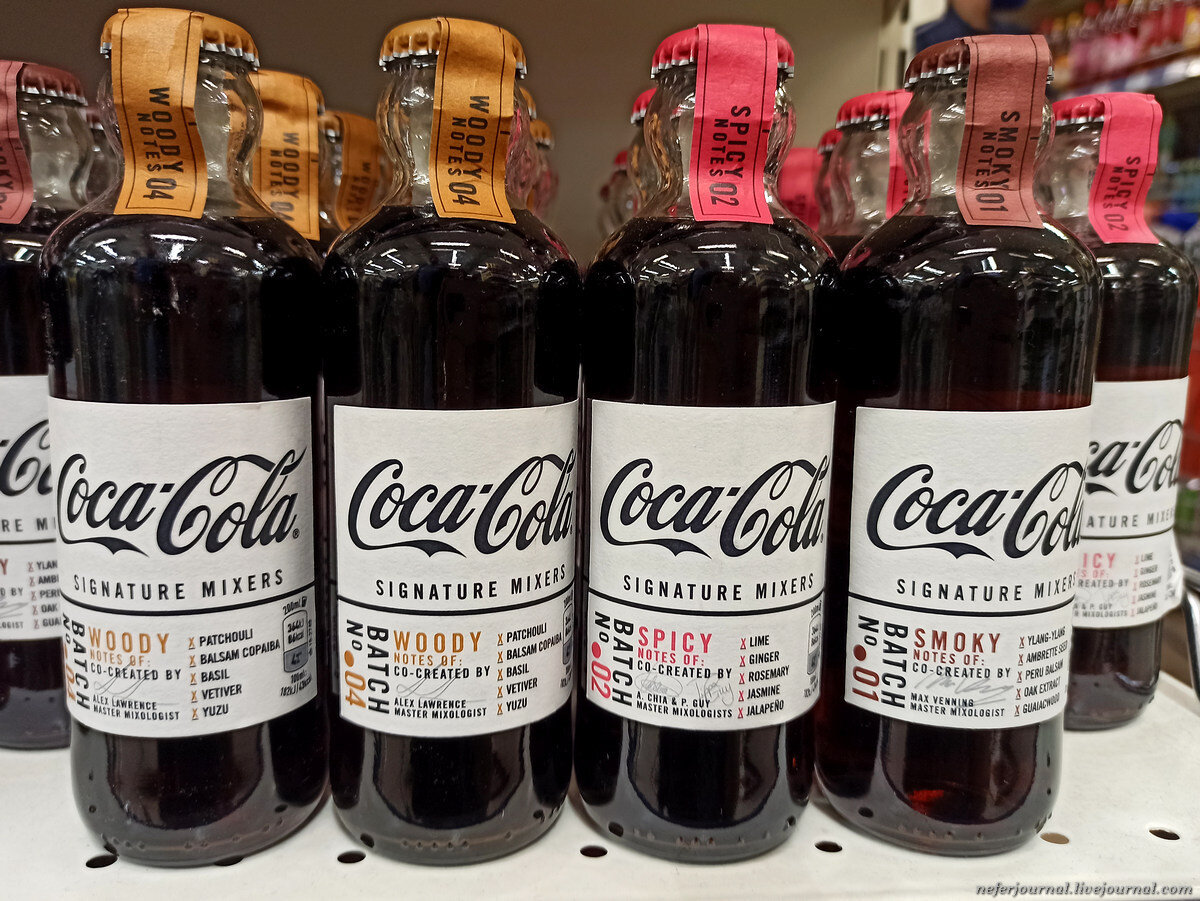 В супермаркете мое внимание привлекли эти бутылочки: Coca-Cola Signature Mixers и Coca-Cola Specialty. Я не видела таких раньше. Как раз недавно у меня был пост 12 самых необычных вкусов Coca-Cola, тем более интересно. Три разных варианта одного вида и три другого. Подошла, покрутила, повертела, изучила. Coca-Cola Signature Mixers - добавки к коктейлям. Smoky cодержит эфирное масло иланг-иланга, а также сухофрукты, восточные специи и оттенки дуба. В Spicy смешали лайм с имбирем и перцем халапеньо, добавив немного розмарина. Для создания аромата Woody использовали индийские пачули, японский юзу и базилик. Еще бывает с укропом, лемонграссом и календулой. Неожиданные ингредиенты, не правда ли? Продажи начались в Великобритании летом прошлого года. Но штрих-код 54, это Бельгия и Люксембург. Напитки отличаются по вкусу от обычной Coca-Cola. Coca-Cola Specialty выпускается ограниченной серией, это лимитированная коллекция. Вкус напитка повторяет Кока-Колу из 1960-х. Разливаетс