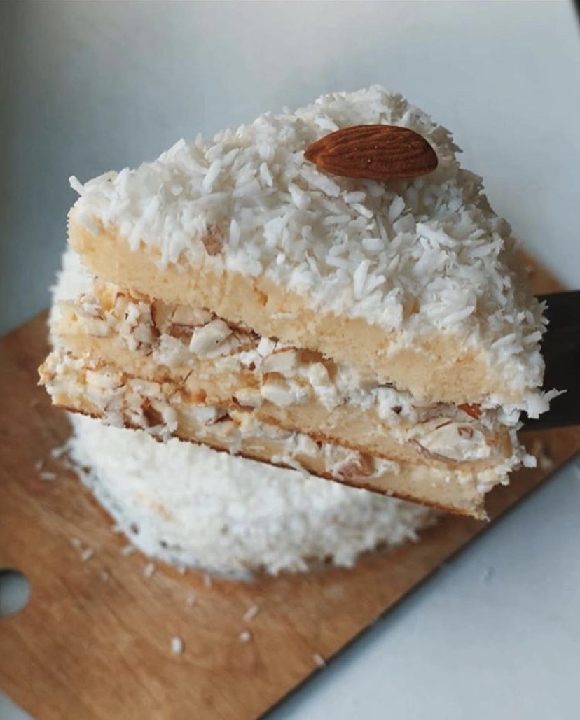 Ингредиенты: рассчитаны для формы 16 см Для бисквита: ▪️130 гр рисовой муки ▪️180 мл молока 2,5% ▪️4 яйца ▪️20 гр сом ▪️1 ч.л. разрыхлителя ▪️Подсластитель ▪️Соль Для крема: 🔸325 гр творога мягкого 0% 🔸Подсластитель 🔸Пропитка(вода + подсластитель) Для украшения: 🔹40 гр Миндаля 🔹40 гр Кокосовой стружки Приготовление: Бисквит: 🔻Отделяем желтки от белков. Белки взбиваем до крепких пиков с щепоткой соли. Желтки до просветления. 🔻Добавляем к желтка молоко, затем просеянную муку, сом, разрыхлитель, подсластитель и перемешиваем. 🔻К смеси добавляем белки и аккуратно перемешиваем снизу вверх(не торопитесь), лучше замешать в 2-3 захода. 🔻Выпекаем бисквит 25 – 30 минут при 180°С. 🔻Ждём когда остынет и разрезаем на 3 части. Крем: ♦️Смешиваем творог с подсластителем. ♦️Миндаль режем ножом, либо в блендере, но не в крошку. Собираем торт: ▫️Корж(пропитываем)➡️Крем➡️Миндаль➡️Корж...украшаем👌🏻 ▫️Затем убираем в холодильник минимум на 4 часа, а лучше на ночь. Способ приготовления⬇️