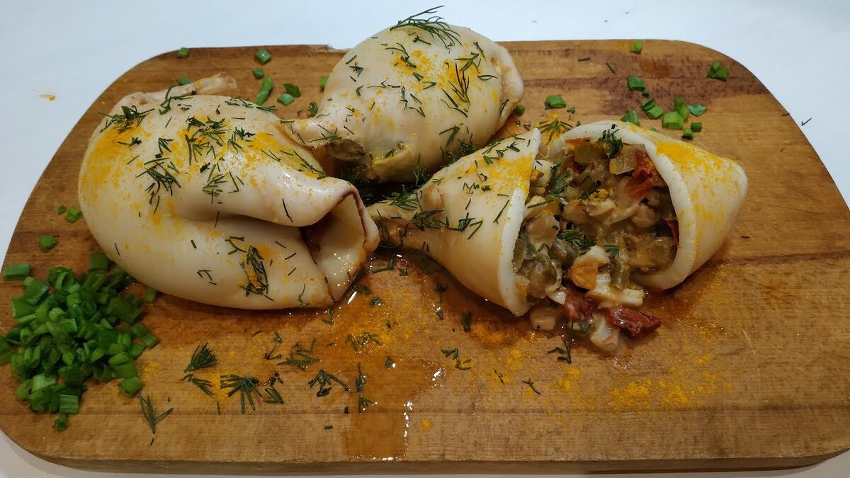 Ингредиенты: чеснок 2 зубчика морковь 100 г кальмары 0,5 кг капуста 150 г сливки 200 мл грибы 50 г помидор 1 шт зеленый лук, соль, перец копченое сало 200 г репчатый лук 1 шт Способ приготовления: мелко нашинковать капусту. Сало нарезать кубиками. Мелко нарезать лук и грибы. Морковь натереть. Помидор нарезать кусочками. Чеснок пропустить через пресс. Лук немного обжарить на разогретой сковороде, добавить сало, обжарить. Добавить капусту, грибы и, в последнюю очередь, тертую морковь, немного обжарить, периодически помешивая. Теперь добавить кусочки помидора и чеснок, перемешать, посолить и поперчить по вкусу, тушить 7 минут и снять с плиты. Промыть кальмары, очистить, наполнить начинкой, выложить в емкость для тушения, залить сливками, немного посолить, довести до кипения и тушить 3 мин. При подаче украсить мелко нарубленным зеленым луком.