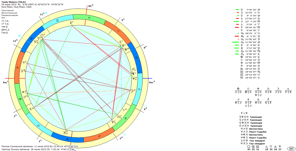 Карта Tesla Мотors (TSLA) весьма хороша. Компания "родилась" в очень успешный (хотя и немного расслабляющий) 17-й лунный день, всё её существование - как один большой праздник )).