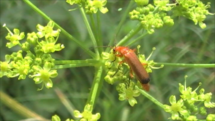 С жуком пожарником мы уже знакомились, теперь давайте познакомимся с его ближайшим родственником, а именно с мягкотелкой рыжей. НЕМНОГО БИОЛОГИИ: Мягкотелка рыжая (Rhagonycha fulva). Насекомые среднего размера, длина имаго 7-11 мм. тело длинное, уплощенное, с мягкой кутикулой. Голова и переднеспинка оранжевого или красноватого цвета. По бокам головы расположены выпуклые фасеточные глаза. Усики длинные, нитевидные, состоят из 11 члеников. Первый сегмент рыжий, остальные черного цвета. Покров гладкий, блестящий с небольшим количеством волосков. Надкрылья почти полностью прикрывают желтое брюшко. Немного выступает краешек задних крыльев. Надкрылья у основания рыжие, на вершине широкая черная полоса. Такая окраска является идентификационным признаком вида. Форма надкрылий близка к прямоугольной, около щитка два выступающих плечевых бугорка. Поверхность в мелких точках и волосках. Задние крылья перепончатые, окрашены в темный цвет, крепятся к заднегруди. Бедра и голени трех пар конечност
