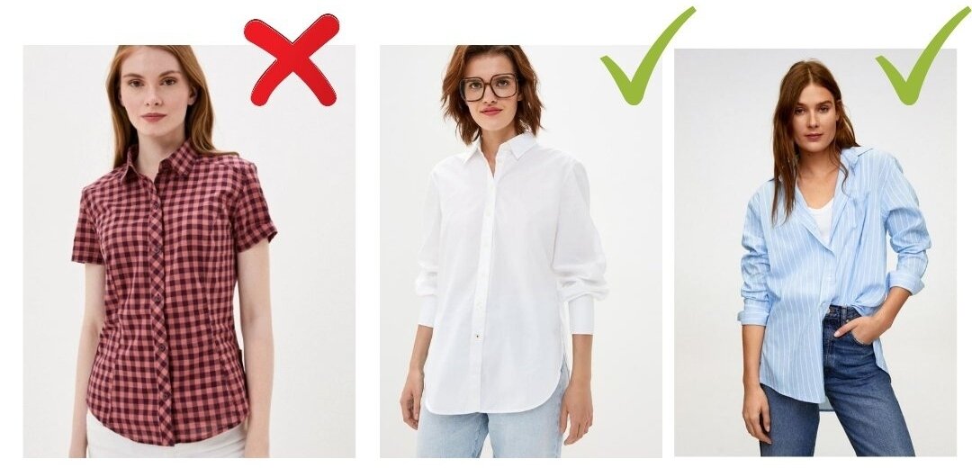 Самый простой и базовый вариант кроя для блузки - это крой по типу футболки. Свободная посадка и рукав выше локтя. Важно, чтобы рукав не было слишком коротким и узким, как на фото слева - это не смотрится стильно. Выбирайте ровный ворот без защипов и избегайте выреза капелькой.
