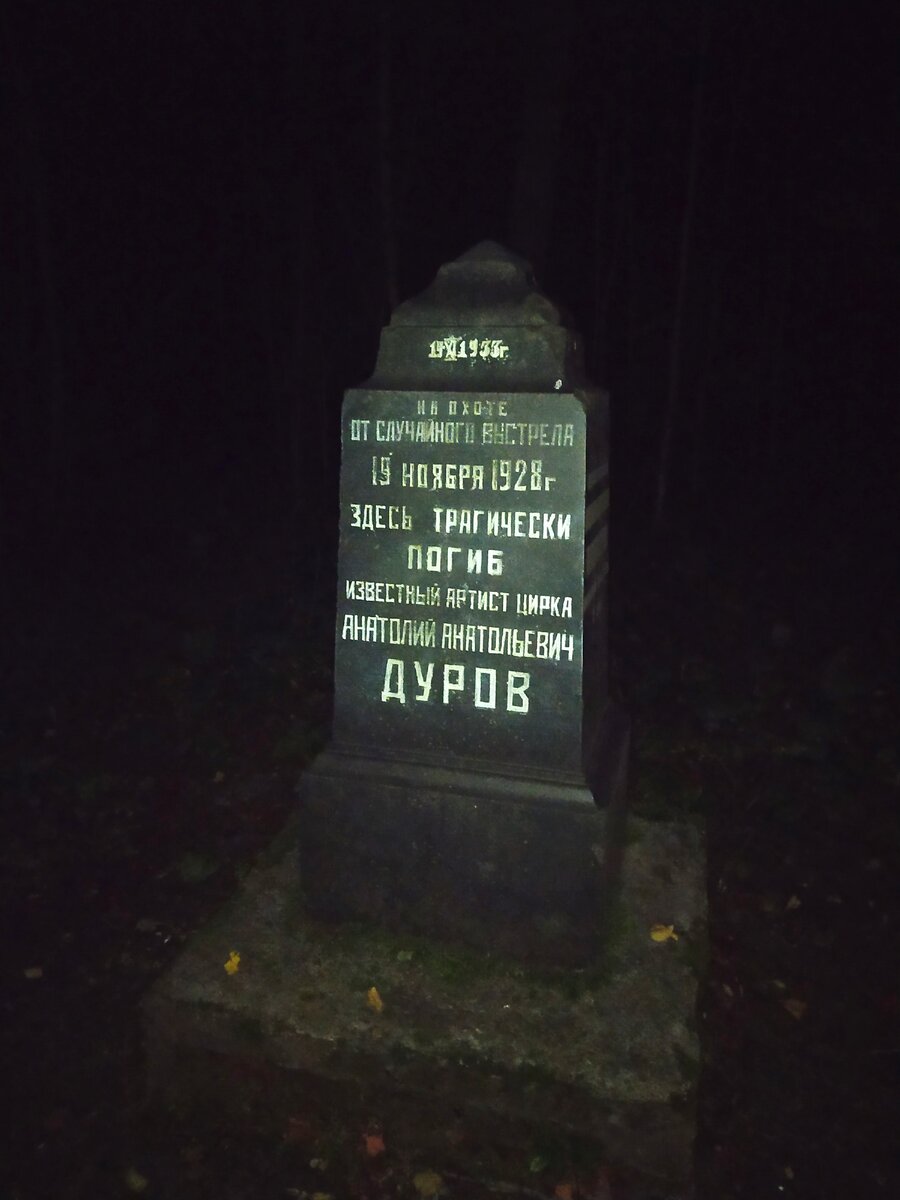 В 1928 году Анатолий Анатольевич Дуров прибыл на гастроли в Ижевский цирк. В паузу между выступлениями он отправился на охоту за зайцами и по стечению обстоятельств был застрелен другим охотником. Подробности произошедшего не известны, также неизвестно был ли это, действительно, случайный выстрел. На месте гибели артиста установлен памятный обелиск.