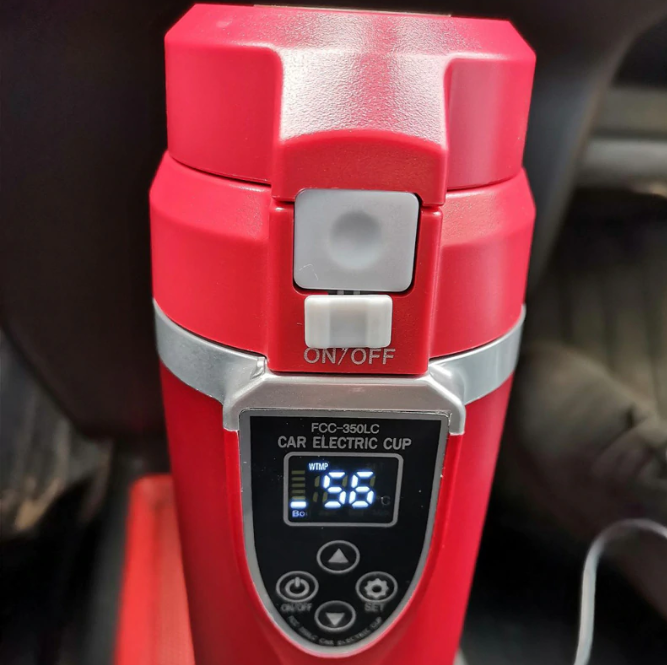 После распаковки чайника, был приятно удивлен качеством сборки. Крепкий пластик, ни каких лишних зазоров и щелей, а главное нет характерного запаха который часто встречается в товарах данного типа.Внутри находится металлический стакан объёмом 350 мл .Крышка плотно закрывается. На передней части находится дисплей с показанием температуры и какой режим включён. Сам чайник находится на съёмной подставке , которая подключается в прикуриватель авто. Можно легко снять с подставки и взять с собой.