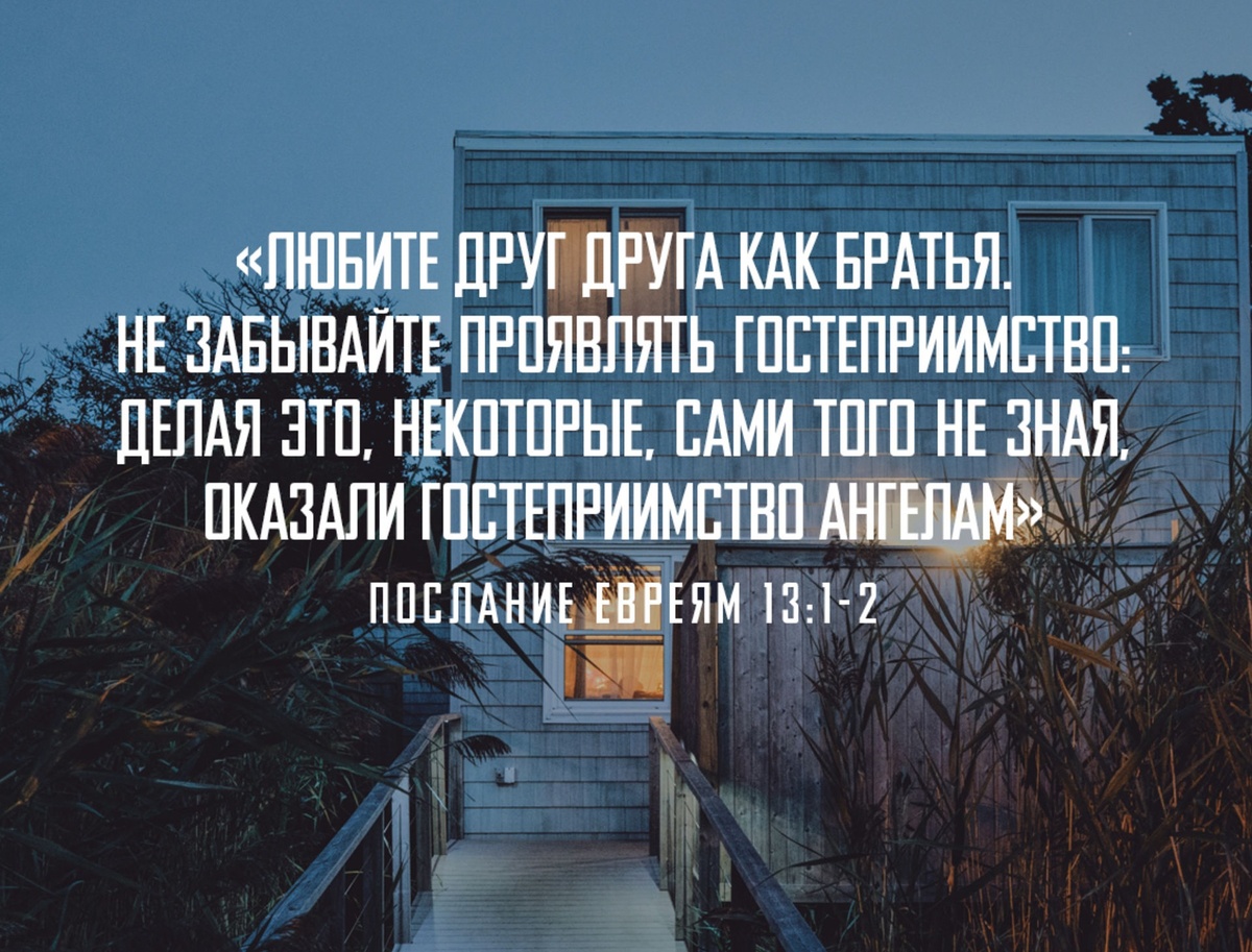 «Братолюбие между вами да пребывает. Гостеприимства не забывайте, ибо через него некоторые, не зная, оказали гостеприимство ангелам. Помните узников, как если бы и вы с ними были в узах, и страждущих, как и сами находитесь в теле».