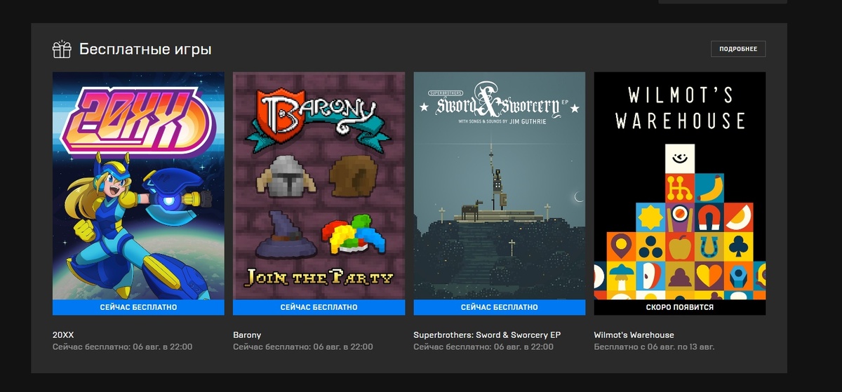 В EPIC GAMES STORE началась очередная раздача и на этой недели раздают 3 игры: 20XX Немного о игре : 20XX — это приключенческий платформер жанра roguelike, в который можно играть вместе с другом. Скачите и палите направо и налево на постоянно изменяющихся уровнях, укрепляйте свой арсенал и крушите суровых боссов во имя спасения чуть ли не всей человеческой расы! Barony Немного о игре: Barony — передовая игра в жанре roguelike от первого лица с кооперативным режимом. Вас ждут загадочные предметы, жестокие ловушки и коварные монстры, подобные тем, которые можно найти в классических рогаликах и компьютерных ролевых играх. Покоряйте подземелья в одиночку или собер... Superbrothers: Sword & Sworcery EP Немного о игре: Помогите странствующей боевой монахине выполнить её долг в Superbrothers: Sword & Sworcery EP, ярком приключенческом экшене от мастеров из Superbrothers и кудесников из CAPYBARA GAMES с выдающимся оригинальным саундтреком от Джима Гатри.