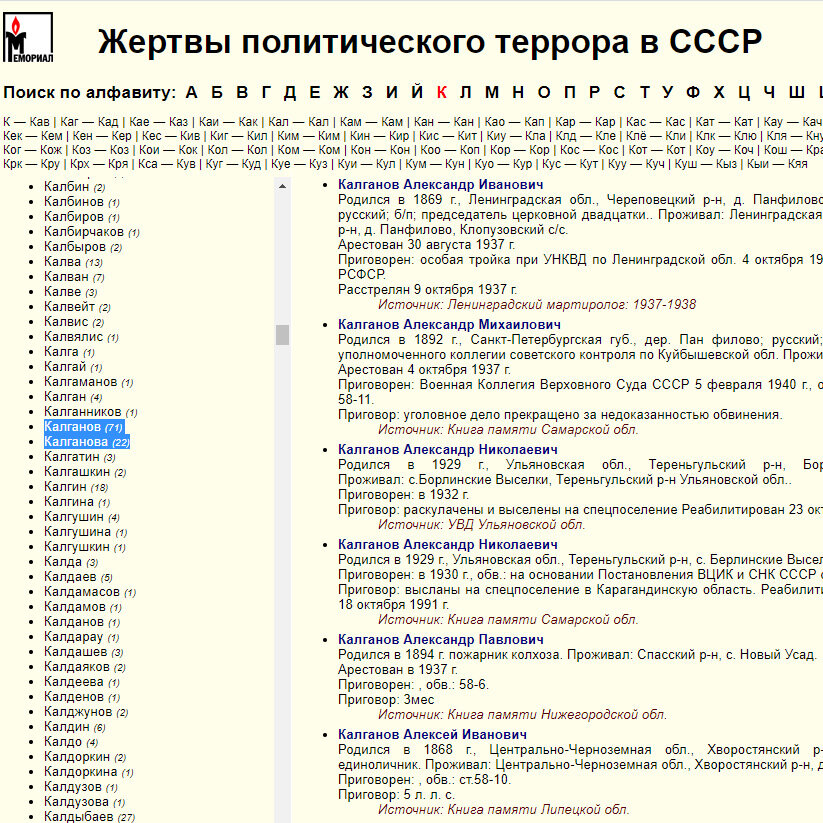 Я уже рассказывал подробно как искать и что за базы памяти репрессированным в статье "Списки репрессированных в СССР, как подспорье в поисках места жительства предков". Ниже я дам сухую выборку по конкретной фамилии для однофамильцев и потомков, а зачем вообще нужно исследовать свою фамилию и составлять генеалогические деревья можно почитать тут.
