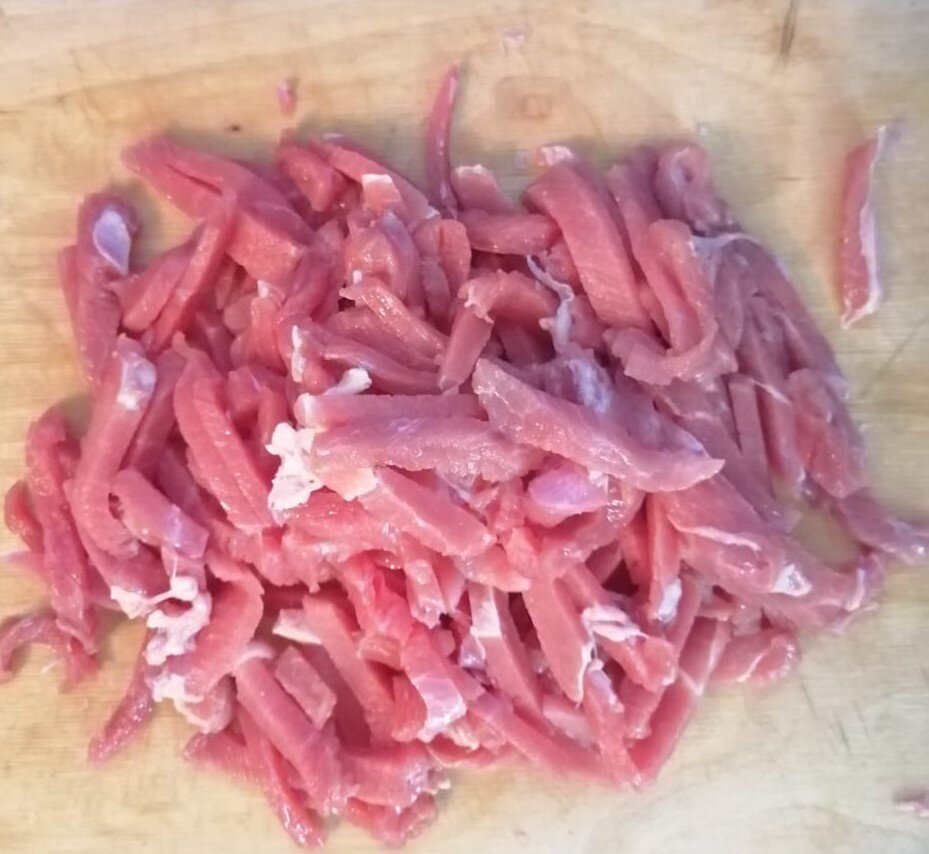 мясо телятины или говядины, побеги чеснока свежие, морковь, лук, соевый соус, пару долек чеснока, масло для жарки