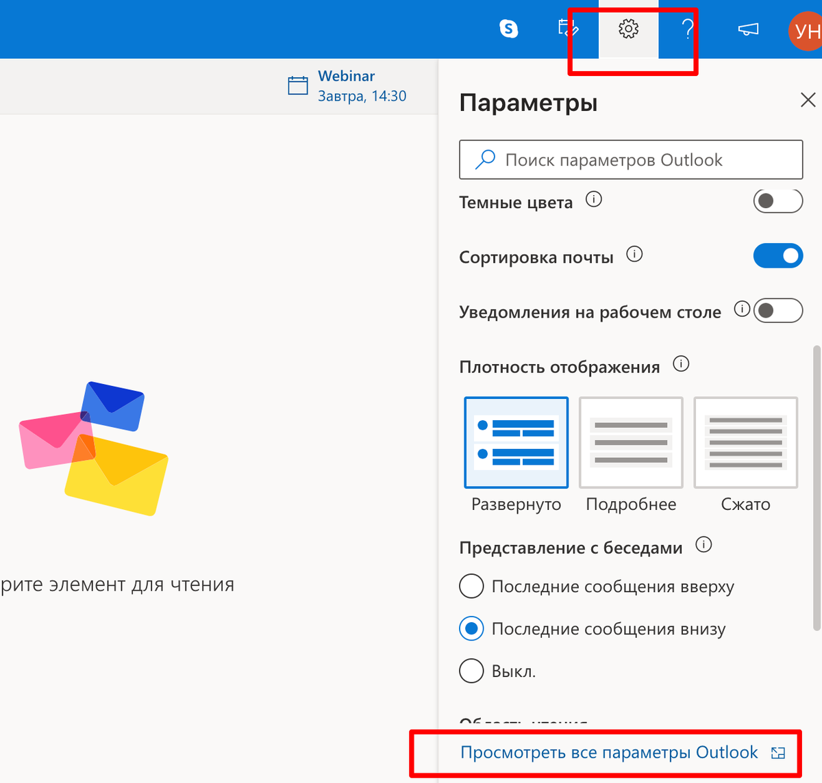 Данная система хороша тем, что переадресация электронной почты из Outlook требует наименьших усилий от пользователя. В верхней части страницы вашего почтового аккаунта откройте настройки и нажмите на ссылку “Просмотреть все параметры Outlook”.