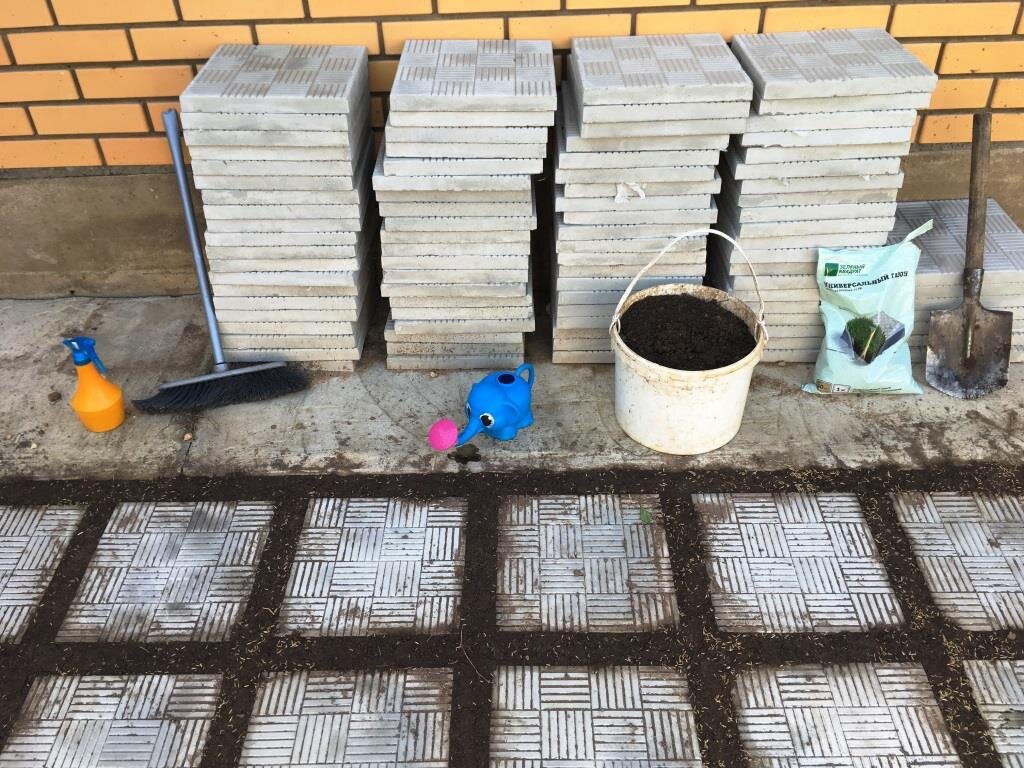 А из материалов нужны: плитка, песок, земля и семена травы для газона.