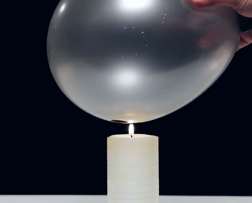 Подержите надутый воздушный шарик над огнём свечи, чтобы показать ученикам, как он лопнет. Затем проделайте то же самое со вторым шариком, наполненным водой. С ним ничего не произойдёт.
