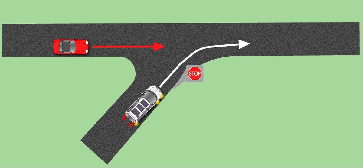 Представим, Вы на красном автомобиле подъезжаете к перекрестку, знаков приоритета у Вас нет, справа к перекрестку подъезжает белый автомобиль. У белого автомобиля стоит знак стоп.