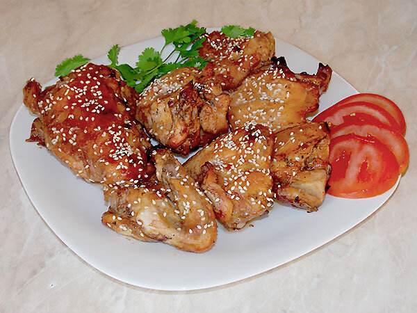 Маринад :3-4 ст ложки соевого соуса1 ч ложка меда1 /2 ч ложки красного острого перцаЧёрный перец по вкусу3 шт душистого перцаОстрый перец по вкусуСладкий болгарский перец 1/2 перчинки2 зубчика чеснока1 ч ложка соли Способ приготовления :Для этого рецепта лучше всего подходят куриные крылья, бедра или ножки. Они более сочные и не пересыхают в духовке в процессе приготовления.Разделать курицу, уложить в ёмкость для маринования.